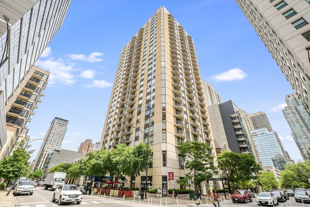 Primely located in River North, this elegant 1-bedroom condo is nestled in a classic full amenity building, the Hermitage on Huron. This home boasts gracious room sizes, HDWD floors, SS appliances, ample closet space with custom organizers and private balcony. Building amenities include: DOORMAN, GYM, LAUNDRY, SAUNA, PARTY ROOM, GROCERY, DRY CLEANERS, & 1-OF-A-KIND FURNISHED COMMON SUNDECK. Low HOA covers water, trash, internet and central heat and cooling. No rental cap in the building. Current lease ends in June 2026 but tenant is able to vacate with 60-day notice. Ideal for either home or investment!