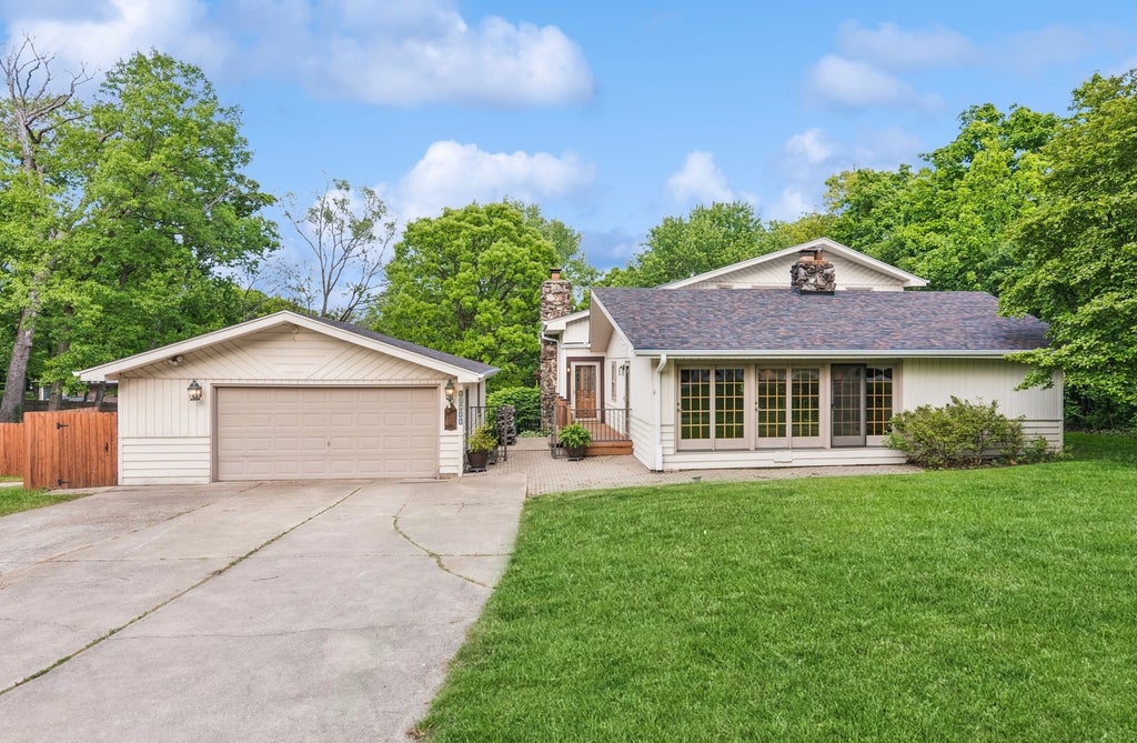 Welcome to your 5BD/2.2BA dream home nestled in a tranquil neighborhood setting surrounded by mature trees and lush greenery. Step inside the bright and inviting great room with a mountain lodge vibe, where soaring vaulted ceilings, new skylights, and natural wood accents complement a striking floor-to-ceiling stone wood-burning fireplace. The open layout and spacious seating areas create a perfect space for cozy nights or lively gatherings. The bright and airy kitchen offers custom cabinetry, a large center island, a sun-drenched breakfast nook framed by a charming arched window, and a door to the deck for grilling or morning coffee and birdwatching. The built-in desk/hutch can act as a family command center, home office or easily convert into a coffee bar! Around the corner from the kitchen you'll find another living area with separate entrance, fireplace and powder room - ideal for a live-work scenario or guest accommodations! The primary suite is located on the main level and has a private entrance to the rear deck. Upstairs you'll find four spacious bedrooms, plenty of hall closets and one full bathroom. The walkout basement is a perfect place for a workshop and storage. This property boasts a crystal-clear heated in-ground pool, expansive wood deck patio, and charming landscaping-perfect for entertaining or relaxing in peaceful privacy. Plenty of parking - room for a trailer/boat and all your cars along with a detached XL 2-car garage. NEW ROOF/Gutters with skylights 2025. This home is in the award-winning Palos School District and still holds the tax benefits of being within unincorporated Palos!