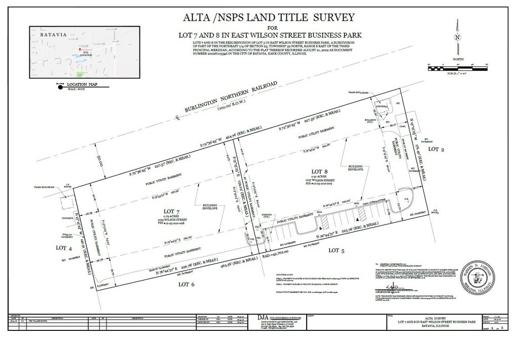 1025 and 1037 E Wilson Street. 1.7 acres ready to build development land on E Wilson Street in Batavia. This property is located 1 mile east of downtown Batavia and 1 mile west of Fermi lab. Wilson street is the main artery that runs through the downtown area. This is a very tight knit community that supports its residents and businesses and the school district is highly rated. Many local events, farmers markets, art shows and festivals take place each year in the downtown area. Zoned "O" which allows a variety of uses including general office, mixed use with residential or retail, data center, hotel/motel, medical or dental office, daycare center, school, urgent care facility, etc..., and Batavia has expressed a willingness to allow the zoning to revert back to the original zoning of OR&I (old extinguished zoning) which may allow additional uses including light industrial, warehousing/storage, laboratories, etc... NOTE: public utility easement shown on plat between lots 7 & 8 can possibly be vacated under original easement agreement with Batavia. Available for sale, Ground Lease or BTS. Approx 32,000 building envelope possible.