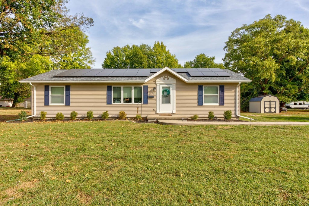 Wonderful ranch features many updates, open floor plan and the option of gas or electric heat. The large living room invites you in and leads to a dining area and kitchen with bountiful cabinetry and updated appliances. The master suite is situated on the east side of the house and features its own bath and closet space. Down the hall are two additional generous bedrooms with another full bath. The current owners have treated this home with care and it shows. Updates include a sizeable garden shed and a new roof in 2024. New kitchen sink and storm doors. The home sits on a large double lot so there is plenty of room to on or add a the garage of your dreams. The solar panels help keep utility bills low.