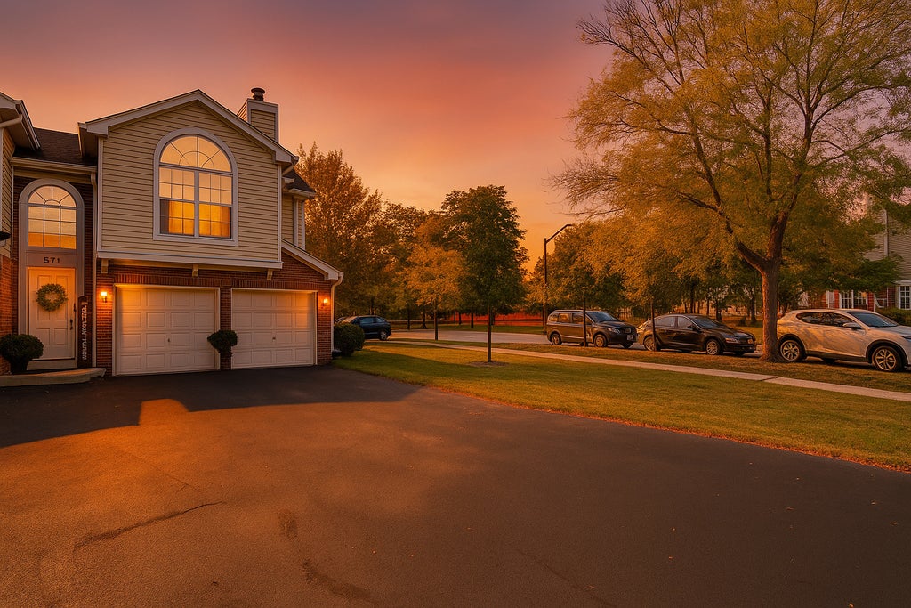 A truly rare opportunity to own a luxury corner-unit townhome in the highly desirable Carriages of Grosse Pointe community, directly across from Carriage Green Park in Vernon Hills and within the top-rated Adlai E. Stevenson High School district. This beautifully updated 3-bed, 2-bath residence offers unmatched finishes, thoughtful upgrades, and custom designer touches throughout. A dramatic 2-story foyer welcomes you to an open-concept layout featuring a stunning wooden staircase, added storage, and a spacious living room with 10-ft ceilings, LED recessed lighting, gas fireplace with marble surround, recessed display niche, and arched double-pane windows flowing into a sun-filled dining area. The chef's kitchen (2022) boasts sleek white soft-close cabinetry, quartz countertops with full tile backsplash, a large 80" x 38" island with seating for four, dual pantry closets, white oak flooring, high-end stainless steel appliances-built-in convection oven/microwave, induction cooktop, 3-door refrigerator, range hood, and new dishwasher (2025)-plus LED lighting and an undermount sink with disposal. The serene primary suite offers floor-to-ceiling windows with day/night shades, a walk-in closet with organizers, and a spa-inspired bath with frameless glass rain shower, soaking tub, heated marble flooring, and espresso double vanity. Two additional spacious bedrooms feature generous closets and new ceiling fans; one includes modern pocket doors and sliding door (2023) opening to a private balcony overlooking lush greenery. Additional highlights: newer HVAC, humidifier & water heater, Ecobee thermostat (2022), updated baseboards, carpets, LED lighting, and laundry room flooring (2022), new side-by-side washer/dryer (2024), 2-car garage with 9-ft ceiling, insulated doors, Chamberlain MyQ openers (2024), new springs (2025), and built-in cabinets. Recent exterior upgrades (2024/2025) include new roof, LP siding, gutters, downspouts & guards; driveway sealed (2025), plus extra parking. Bonus features: TV brackets, day/night shades throughout, and new park playground equipment coming soon. Prime location near Hawthorn Mall, Trader Joe's, Mariano's, Metra, restaurants, parks, water park, Costco & more-truly move-in ready with neutral decor, offering the perfect blend of luxury, comfort & convenience.